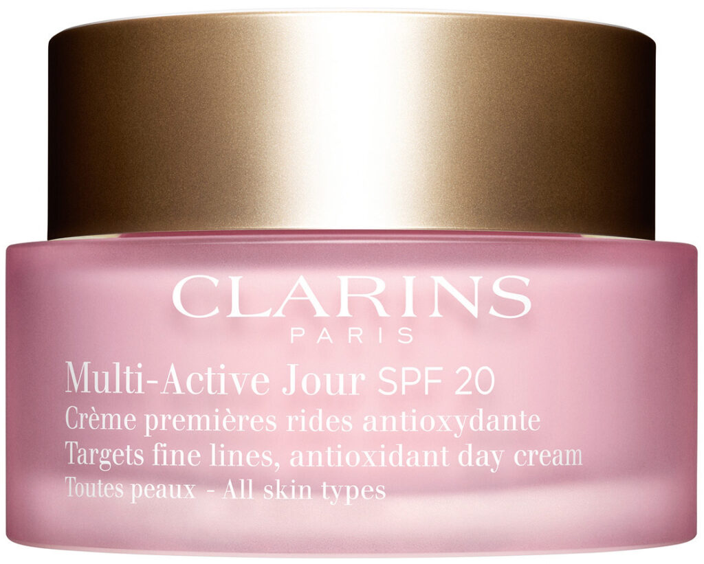 - Clarins Multi-Active Jour SPF 20. Naiset, jotka haluavat ehkäistä ja hoitaa ikääntymisen ensimerkkejä, kuten juonteita, heleyden puutetta ja väsymyksen merkkejä, sekä suojata ihoa esimerkiksi stressin, saasteiden ja unenpuutteen vaikutuksilta. Multi-Active Jour Spf 20 on raikas geelivoide kaikille ihotyypeille, ja siinä on hedelmäinen ja kukkainen kirsikan ja valkoisen syreenin tuoksu.